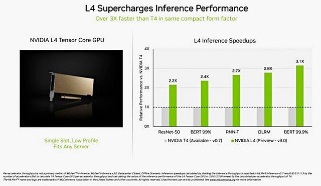 엔비디아 L4 텐서 코어 GPU는 이전 세대 T4 GPU보다 3배 이상 빠른 속도로 MLPerf 테스트에 데뷔했다. 프로파일이 낮은 폼 팩터(low-profile form factor)로 패키징된 가속기는 거의 모든 서버에서 높은 처리량과 짧은 지연 시간을 제공하도록 설계됐다.