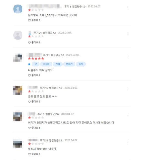 별점과 함께 주관식으로 적는 리뷰에는 이유 없는 비방 게시물이 잇달아 올라오고 있다. “굥(윤석열 대통령의 멸칭) 묻은 곳” “글쎄요, 다신 가고 싶진 않습니다...” “일도 안 하고 술이나 퍼먹으러 다니는 사람들이 픽한 맛집” “앞으로 해운대에서 거를 횟집 하나 생겼네” “여기가 그 유명한 용산파가 회식한 곳이군요” 등이었다.