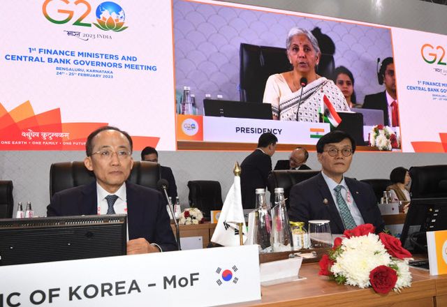 추경호 경제부총리 겸 기획재정부 장관(왼쪽)이 24일 오전(현지시간) 인도 벵갈루루에서 열린 G20재무장관 중앙은행총재회의에 이창용 한국은행 총재와 참석하고 있다.(사진=기획재정부 제공)
