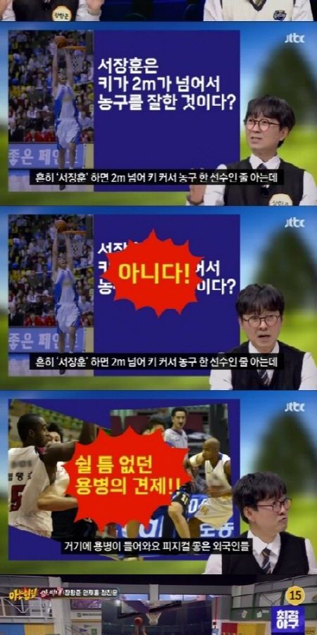 장항준은 "서장훈 하면 2m 넘어 키 커서 농구 한 선수인 줄 아는데 운동 신경이 좋고 슛이 굉장히 정확하다. 서장훈이 있던 골 밑은 전쟁터다. 용병이 들어온다. 피지컬 좋은 외국인들에게 전혀 밀리지 않고 압도한 유일한 한국인이다. 골밑에서 한 번도 득점을 놓치지 않는다"라며 칭찬했다.