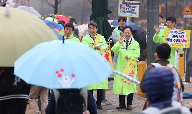 이주호 사회부총리 겸 교육부 장관(가운데)이 3월 23일 오전 세종시에 있는 도담초등학교 인근 횡단보도에서 등굣길 어린이 교통안전 캠페인을 하고 있다. [사진=연합뉴스]
