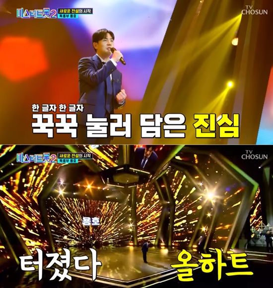 이토록 열정적으로 '미스터트롯2' 여정을 시작한 용호는 1차 예선에서 태진아의 '당신의 눈물'을 선곡, 호소력 짙은 목소리로 마스터들의 마음을 단번에 사로잡았고 '올하트'가 터졌다. "독종부 1번 참가자로 무대에 올랐다. 나름 가요제에서 무대 경험을 쌓았다고 생각했는데 차원이 다르더라. 처음부터 끝까지 어떻게 노래 불렀는지 기억이 없다. 벌벌 떨면서 노래 불렀다. 올하트가 나왔을 때는 너무 놀라서 눈물도 나오지 않았다."