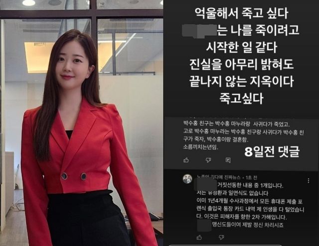 김다예는 또 다른 게시물에 "억울해서 죽고 싶다. 진실을 아무리 밝혀도 끝나지 않는 지옥"이라며 그동안의 힘든 심경을 드러냈다.
