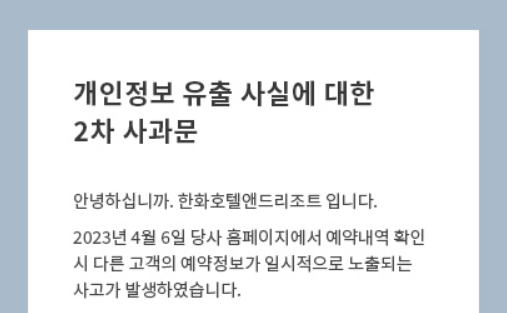 한화호텔앤드리조트는 "지금까지 외부 유출로 개인정보가 악용된 의심 사례는 발생하지 않았다"며 "추후 의심되는 상황이 있으면 한화호텔앤드리조트 측에 이메일로 문의해하길 바란다"고 안내했다. 이어 "이같은 일이 발생한 점에 대해 깊은 책임을 통감하고 있다"고 사과했다.