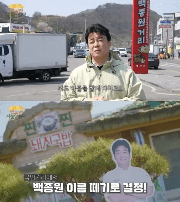 7년 전, 예산군은 지역 활성화를 위해 임시천막에서 하던 국밥집들을 모아 매장을 짓고, 국밥거리를 조성했습니다. 이후 마케팅 효과를 위해 ‘백종원 거리’라는 이름을 붙이기를 원했습니다.