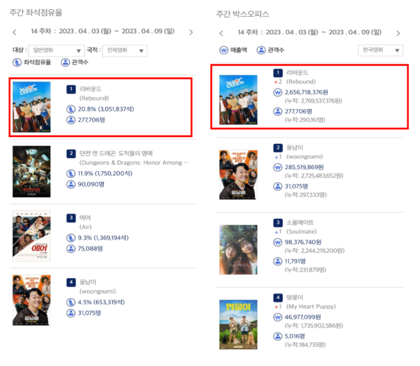 '리바운드'는 2012년 전국 고교농구대회, 아무도 주목하지 않았던 최약체 농구부의 신임 코치와 6명의 선수가 쉼 없이 달려간 8일간의 기적 같은 이야기를 그린 감동 실화다. 5일 연속 한국영화 및 동시기 개봉작 박스오피스, 좌석점유율 모두 1위를 기록했으며 CGV 골든에그지수가 98%로 상승, 메가박스 실관람 평점이 9점으로 상승하며 장기 흥행 청신호를 켰다. 특히 관객 수가 늘면 관람 평점이 낮아지는 것이 보통인데, 이례적인 상승을 기록해 눈길을 끈다.