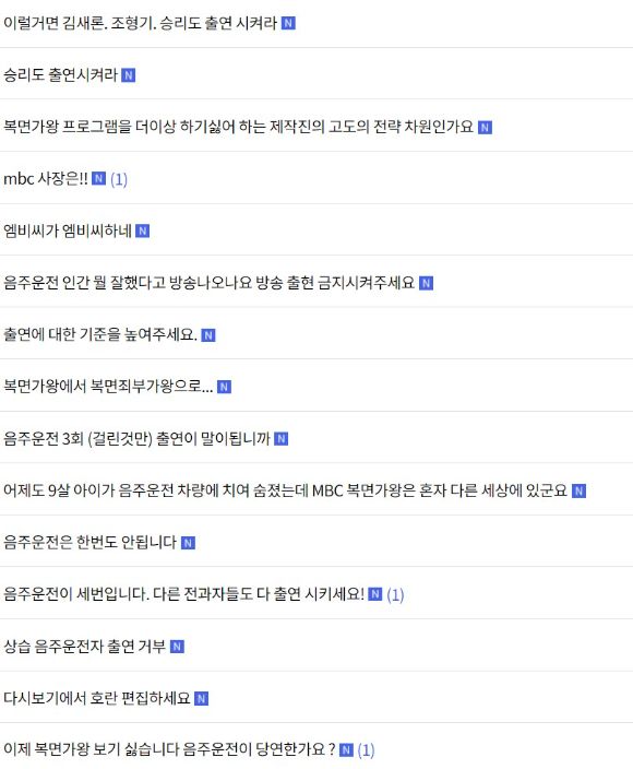 특히 일부 시청자들은 최근 음주운전 차에 치여 사망한 9세 여아의 사고를 언급하기도 했다. 이들은 "초등학생이 음주운전으로 사망한 날 (음주운전으로) 삼진 아웃당한 범죄자가 출연을 하냐" "9살 아이가 음주운전 차에 치여 숨졌는데 복면가왕 혼자 다른 세상에 있나 보다" 등 말을 하며 제작진을 거세게 질타했다.