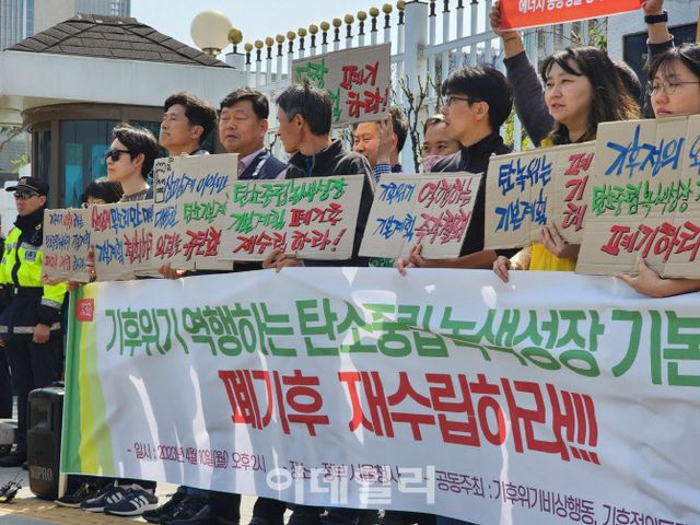 기후위기비상행동 등 환경·시민단체는 이날 오후 2시 서울 종로구 정부서울청사 앞에서 기자회견을 열고 “기후위기 역행하는 탄소중립 녹색성장 기본계획 폐기 후 다시 수립하라”고 외쳤다.