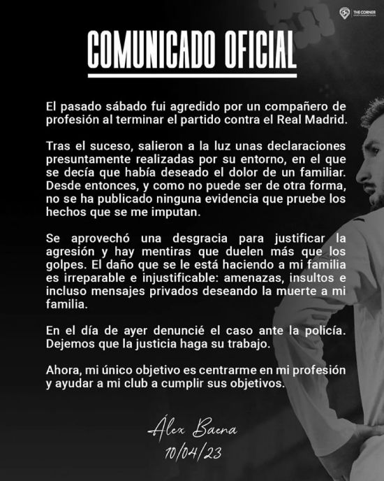 바에나는 이후 성명서를 통해 "지난 토요일, 난 레알 마드리드와의 경기 후 한 동료로부터 공격을 당했다. 사건 후 상대의 측근에게서 나온 몇몇 발언들이 조명됐고 내가 그의 가족이 아프길 바랐다는 것이다. 물론 나를 기소할 어떠한 증거도 나오지 않았다"라고 말했다.
