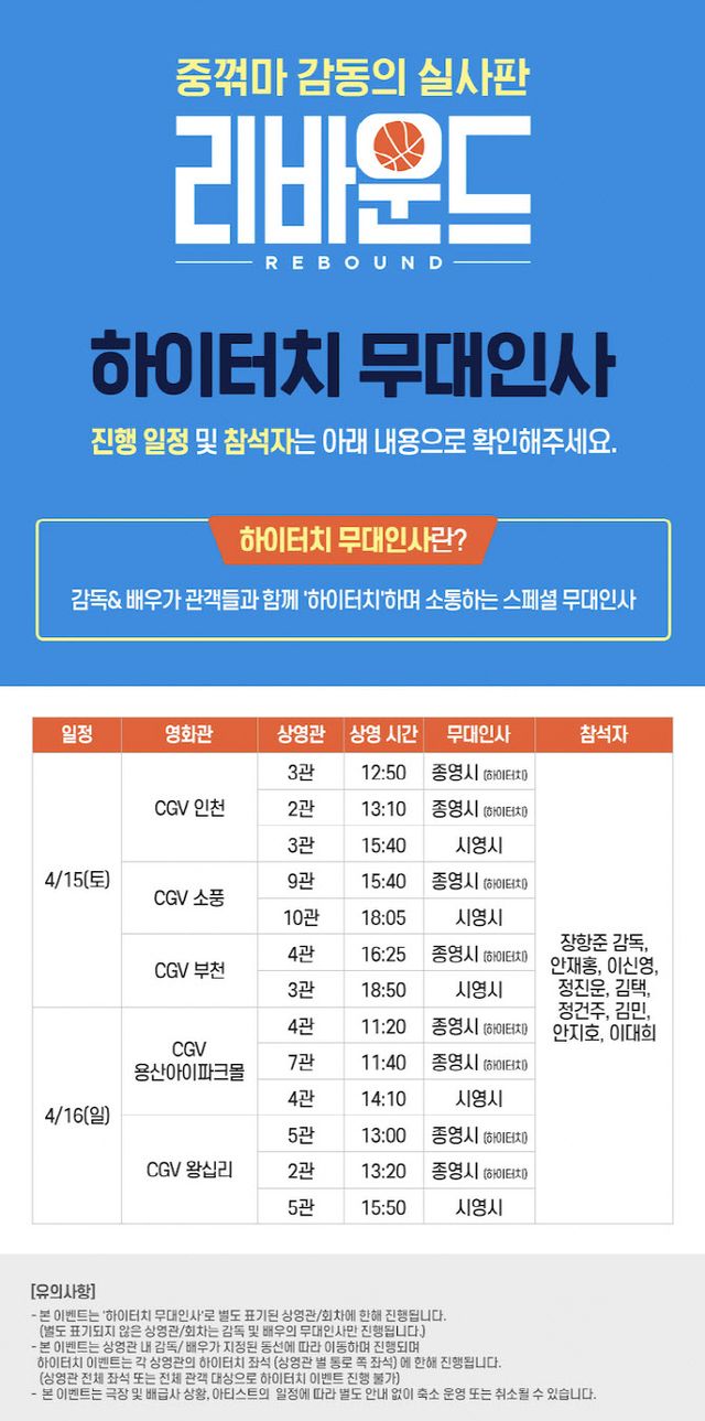 관객들의 성원에 힘입어 개봉 2주 차 경기-서울 지역 무대인사도 확정 지었다. 무대인사는 오는 15일(토) 메가박스 송도를 시작으로 CGV 인천, 롯데시네마 인천아시아드, CGV 소풍, CGV 부천, 롯데시네마 부천에서 진행되며 16일(일)에는 CGV 용산아이파크몰, CGV 왕십리, 메가박스 코엑스, 롯데시네마 월드타워에서 관객들을 만난다. 아주 특별한 관객 참여형 상영회도 진행한다. 감독과 배우가 상영관 내 관객들과 하이파이브를 하는 하이터치 상영회와 부산중앙고의 기적 같은 이야기를 자유로운 리액션과 함께 응원하며 볼 수 있는 응원 상영회가 예정되어 있다. 스크린 속 감동을 더욱 뜨겁게 느낄 수 있는 기회, ‘리바운드’의 무대인사와 특별 상영회 티켓은 각 극장 사이트를 통해 예매할 수 있다.