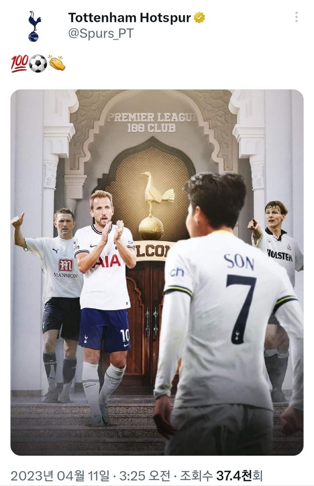 토트넘 구단이 SNS를 통해 손흥민의 100골을 1초에 한 골씩 100초간 보는 동영상까지 만들어 배포한 가운데, 손흥민과 과거 프리미어리그 100골을 달성한 토트넘 레전드들이 함께 등장한 그림도 나타났다.
