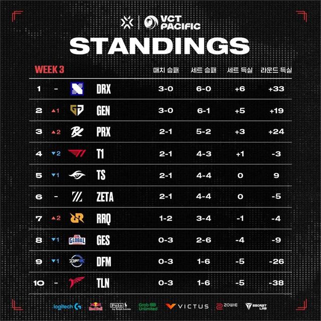 무실 세트 행진을 이어가고 있는 DRX는 세트 득실 +6으로 3주 연속 1위를 차지했다. DRX와 함께 3연승을 이어가고 있는 젠지는 세트 득실 +5를 기록하며 2위에 자리했고 T1은 한국 팀으로는 첫 패배를 당하며 2승1패, 4위로 내려갔다.