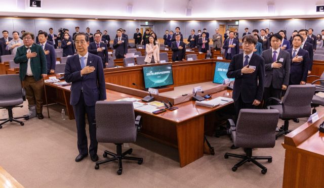▲한덕수 국무총리가 10일 오후 서울 종로구 정부서울청사 별관에서 열린 2050 탄소중립 녹색성장위원회 전체 회의에서 참석해 국기에 경례하고 있다. ⓒ연합뉴스
