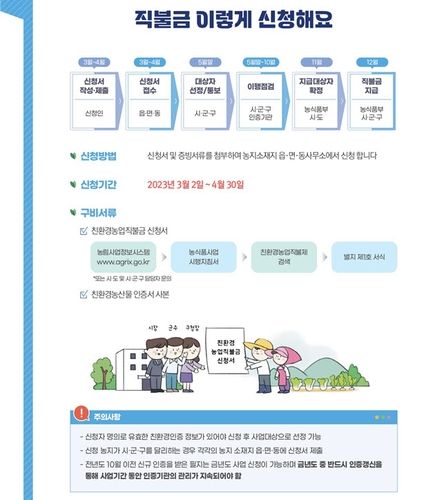 '친환경직불금'과 친환경농업 유지 보전을 위해 전남도가 추진하는 '유기·무농약 지속 직불금'을 받으려면 친환경농산물(유기·무농약) 인증을 받고 4월 30일까지 농지 소재지 읍면동 주민센터에 직불금 신청서와 친환경농산물 인증서 사본을 첨부해 제출하면 된다. 직불금 지급 대상자로 등록되면 5~10월 이행 점검 기간을 거쳐 12월에 지급받을 수 있다.