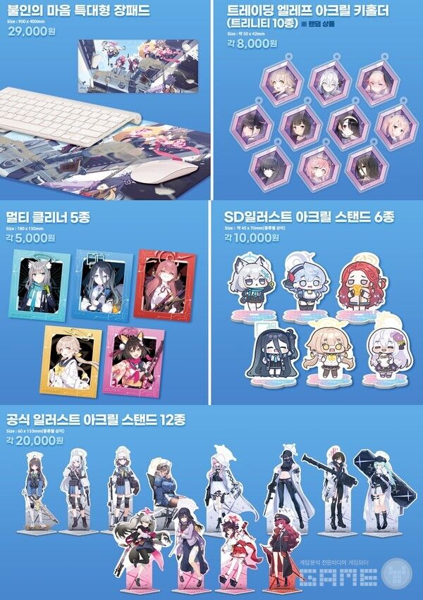 합정 애니플러스의 ‘블루 아카이브’ 팝업스토어 굿즈로는 불인의 마음 특대형 장패드, 트레이딩 엘레프 아크릴 키홀더, 게헨나 트레이딩 캔뱃지, SD 일러스트 아크릴 스탠드, 풀 프린팅 티셔츠 등의 다양한 굿즈가 준비되어 있다.