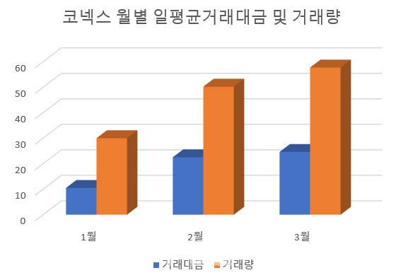 월별 추이를 봐도 코넥스 시장에서의 투자 심리는 살아나고 있다. 올해 1월 일평균 거래대금 10억5000만원에서 2월에는 22억5000만원으로 2배 늘었다. 3월에는 일평균 거래대금이 24억6000만원까지 증가했다. 일평균 거래량도 △1월 30만주 △2월 50만2000주 △3월 57만7000주 등으로 불어났다.