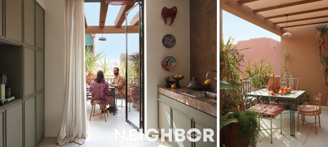 (왼쪽) 세이지 그린 컬러의 수납장과 주문 제작한 모로코 전통 유약 타일로 단장한 주방. 벽면에 걸린 이국적인 세라믹은 포르투와 멕시코 여행에서 구입한 것이다. (오른쪽) 주방과 연결된 베란다에는 로랑스가 운영하는 디자인 브랜드 LRNCE의 철제 의자와 테이블이 놓여 있다.