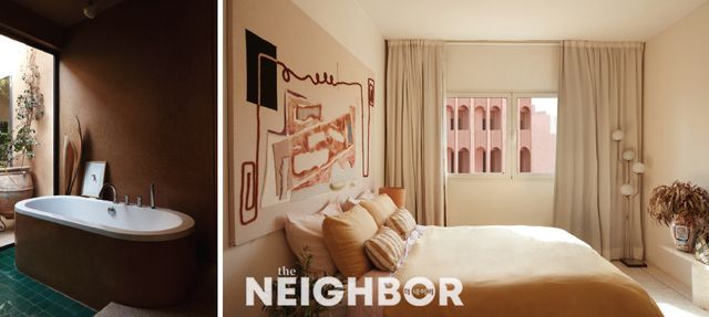 (왼쪽) 모로칸 전통 타일과 테라코타 느낌의 방수 회벽으로 마감한 욕실은 야외 파티오 공간 전망까지 품는 이상적인 휴식처다. (오른쪽) 모로코의 붉은 흙과 햇빛을 닮은 톤의 침실. 침대 머리맡에 있는 작품은 직조와 자수, 회화와 그라피티가 조합을 이룬 것은 로랑스의 작품이다. 리넨 베딩은 파리의 메르시 편집숍에서, 플로어 램프는 이탈리아 빈티지, 화병은 LRNCE 디자인이다.
