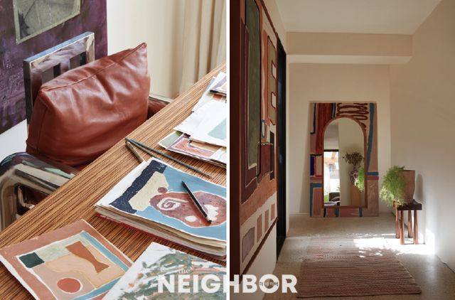 (왼쪽) 로랑스는 집에서 항상 그림을 그리며 명상을 즐긴다. (오른쪽) 현관 홀에는 로랑스가 그린 회화 작품과 터프팅 기법으로 짠 카펫으로 프레임을 장식한 LRNCE 거울이 걸려 있다.