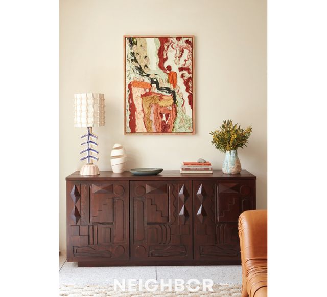 거실에 놓인 삼나무로 만든 코모드는 로랑스가 디자인하고 목공예 장인이 손으로 조각해 완성한 수공예품이다. 벽에 걸린 그림은 나타샤 만코우스키(Natacha Mankowski) 작품.