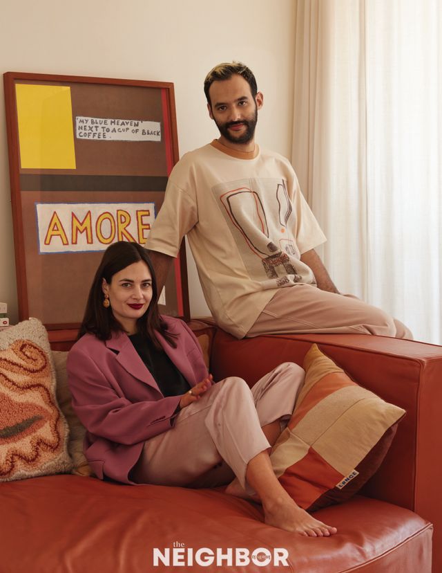 디자이너 로랑스 레이나르트(Lurence Leenaert)와 남편 아욥 보알람(Ayoub Boualam)이 자신들이 디자인한 소파에 앉아 있다. 소파 뒤 아트 프린트는 나탈리 두 파스퀴에(Nathalie Du Pasquier)의 작품이다.
