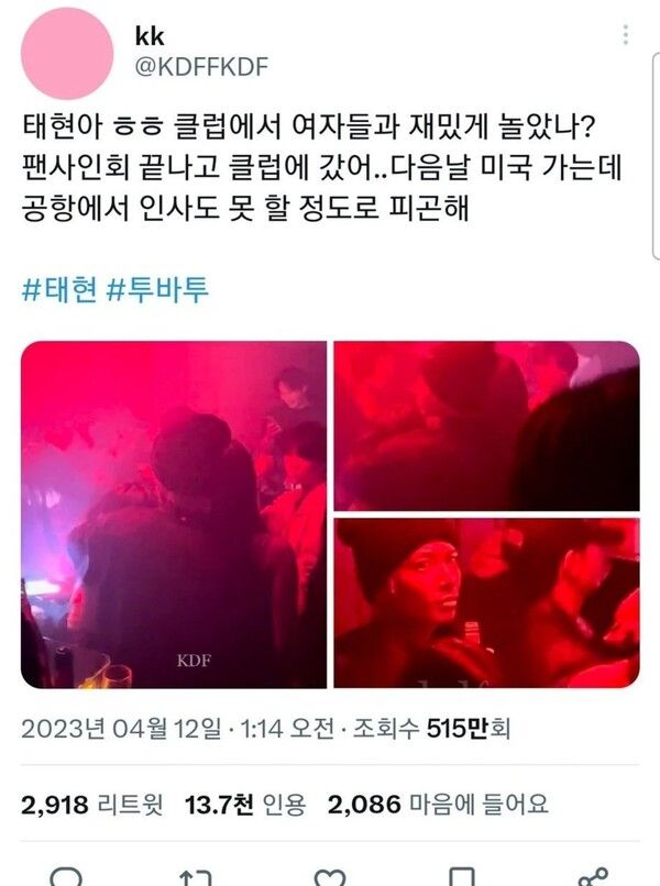 그룹 투모로우 바이 투게더 태현의 클럽 목격담이 온라인 커뮤니티와 트위터 등에 등장하며 화제가 되고 있다.