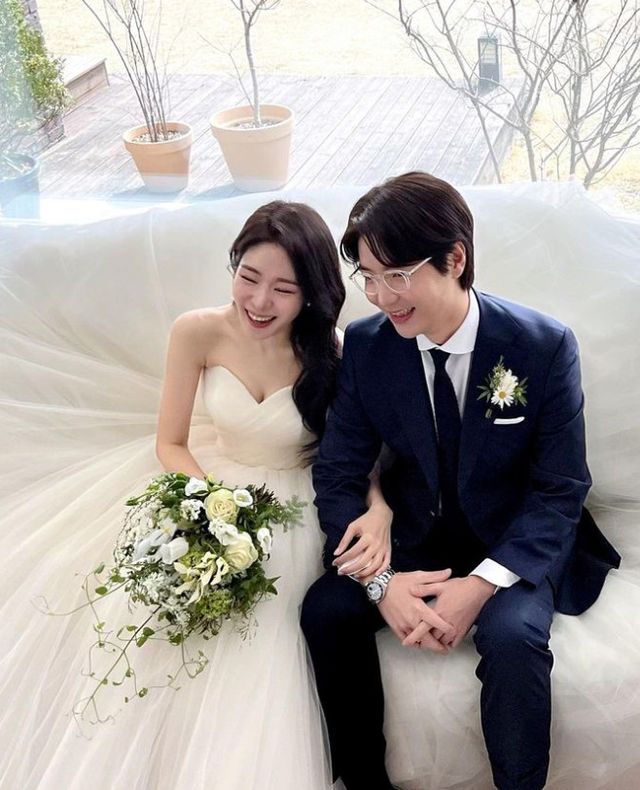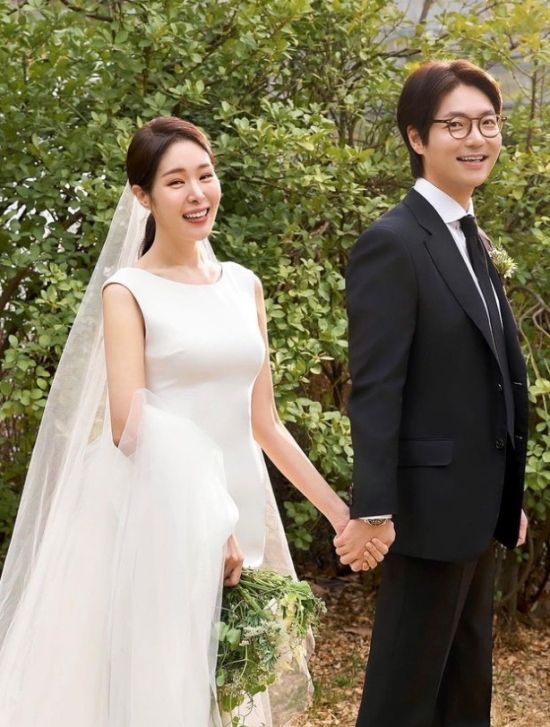 공개된 사진에는 미자와 김태현의 웨딩 화보 사진이 담겨 있다. 이들은 카메라를 향해 환하게 미소를 짓고 있다.