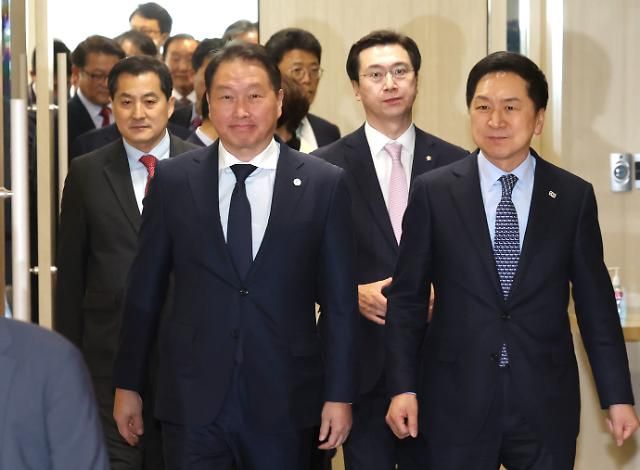 최태원 대한상의 회장은 "경제와 안보는 한 몸으로 반도체와 자동차, 배터리 등 첨단산업 경쟁이 중요하다"며 "과감한 정책적 결정을 해줬으면 한다"고 당부했다.