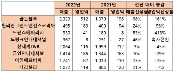 골든블루 관계자는 “작년에는 엔데믹에 유흥주점 등 매출이 증가했고, 싱글몰트 위스키에 대한 관심이 커지면서 수혜를 입었다”며 “고환율에 물류비용 증가 등 대외여건이 좋지 않은만큼 올해도 긴장을 늦추지 않고 성장세를 이어갈 수 있도록 하겠다”고 설명했다.