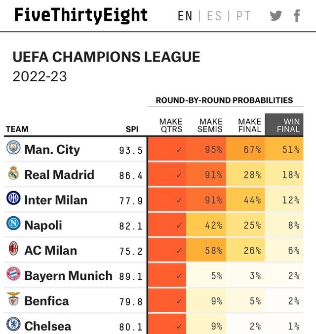 8강 1차전 4경기가 종료된 뒤 데이터 분석 업체 ‘파이브서티에이트’는 4강 진출 확률과 결승 진출 확률 그리고 우승 가능성에 대한 분석을 공개했다. 51%의 우승 가능성으로 가장 높은 우승 확률을 지닌 팀은 맨시티였다. 매체는 맨시티의 4강 가능성을 95%, 결승 진출 가능성을 67%로 바라봤다. 맨시티는 대진 추첨 이후 우승 가능성이 28%였지만 1차전 이후 23% 증가했다.