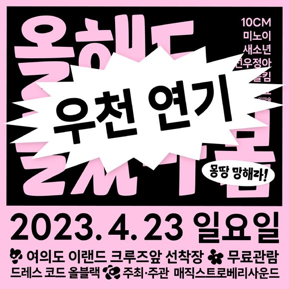 이번 공연의 주최 및 주관사 매직스트로베리 사운드는 지난 12일 10CM 공식 SNS에 "15일 오후 1시 30분 서울 여의도의 이랜드 크루즈 선착장 앞에서 진행 예정이었던 '2023 올해도 글렀나봄'이 우천 예보로 인해 23일로 연기됨을 안내 드린다"고 밝혔다.