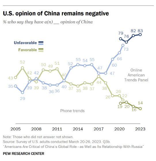 조사 대상의 절반 이상이 중국을 경쟁자로 인식했고, 중국이 동반자라는 응답은 6%에 그쳤다. 응답자의 83%가 중국에 대해 비판적인 의견을 가진 것으로 조사돼 부정적 의견은 역대 최고치를 기록했다.