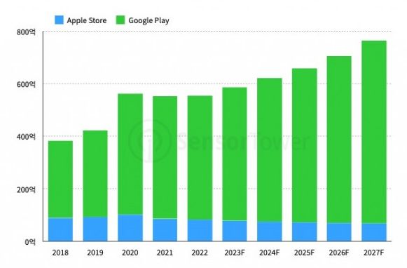 모바일 시장 데이터 분석 업체 센서타워는 13일 '2023년 전 세계 모바일게임 시장 전망' 리포트를 발표하면서 이같이 밝혔다. 세계 모바일게임 시장에 대해 분석하고 2027년까지 전망을 담은 내용이다.