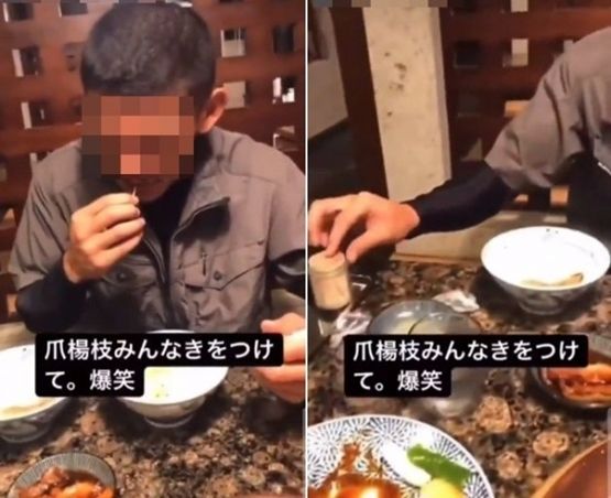 영상 속 한 남성은 각 자리에 마련된 이쑤시개 통에서 이쑤시개 하나를 빼서 사용한다. 이후 사용한 이쑤시개를 도로 통에 집어넣고 뚜껑을 닫는다. 이를 촬영하고 있는 남성은 다른 남성을 말리지 않고 웃기만 했다.
