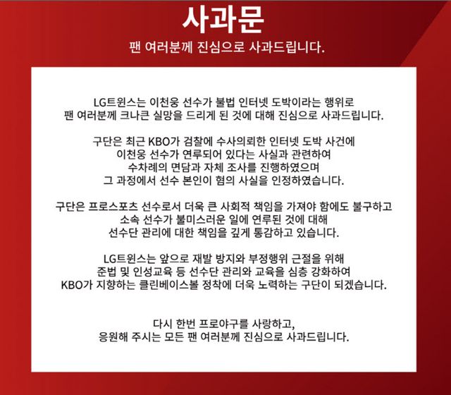 LG 구단은 “이천웅 선수가 불법 인터넷 도박이라는 행위로 팬 여러분께 크나큰 실망을 드리게 된 것에 대해 진심으로 사과드린다”며 “프로스포츠 선수로서 더욱 큰 사회적 책임을 가져야 함에도 불구하고 소속 선수가 불미스러운 일에 연루된 것에 대해 선수단 관리에 대한 책임을 깊게 통감하고 있다”고 밝혔다.