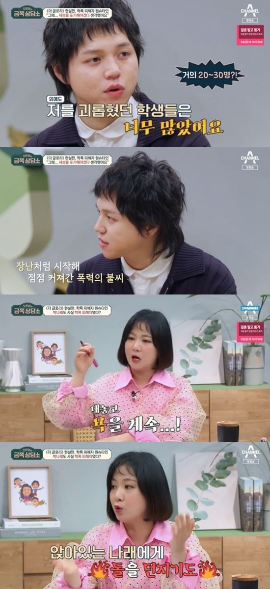 이어 "돈을 빼앗겨 본 적도 있다. 돈을 주지 않았을 때 생길 일들이 머릿속에 그려졌다. 교과서를 빌려 갔다가 돌려주는 방식으로 폭력을 행사하기도 했다. 교과서를 받으러 가면 눈앞에서 던져 주워 가게 만든 친구도 있었다"고 덧붙였다.