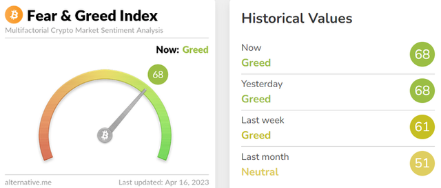 한편 비트코인의 투자심리는 2021년 11월 이후 최고로 살아난 모습이다. 이날 암호화폐 데이터 제공 업체 얼터너티브(Alternative)의 자체 추산 '공포·탐욕 지수'는 68을 기록하며, '탐욕' 단계가 지속됐다. 해당 지수는 0에 가까울수록 시장의 '극단적 공포'를 나타내며, 100에 가까울수록 '극단적 낙관'을 의미한다.