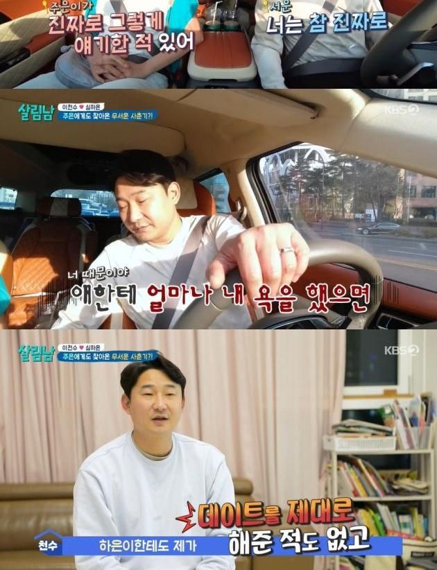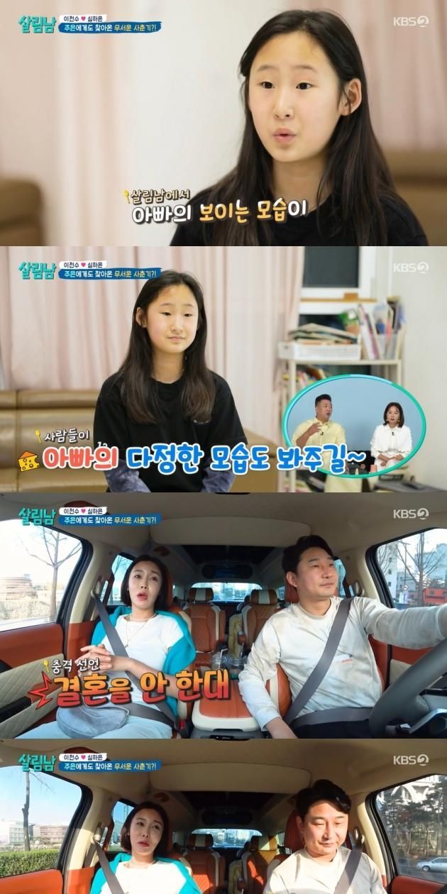 뉴스1에 따르면 지난 15일 방송된 KBS 2TV '살림하는 남자들2'에서는 이천수 심하은 부부의 딸 이주은이 데이트를 제안하는 모습이 그려졌다. 이날 방송에서 이주은은 "엄마 아빠는 데이트해본 적 있어?"라며 "이 기회에 데이트 한번 해봐, 내가 데이트 코스 짜줄게"라고 말했다. 하지만 이천수와 심하은은 심드렁한 반응을 보였다.