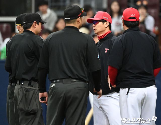 이때 함지웅 구심이 1루로 다가가 1루심과 판정에 대해 논의했고, 이내 심판진이 함께 대화를 나눴다. 함지웅 구심은 최종적으로 사구를 선언했다.