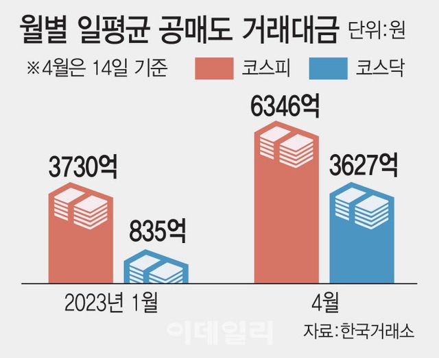 16일 한국거래소에 따르면 이달(4월3~14일) 일평균 코스피 공매도 거래대금은 6346억원으로 집계됐다. 코스닥시장은 3627억원으로 확인됐다. 양대 증시의 이달 일평균 공매도 거래대금 규모는 지난 2001년 월별 데이터를 집계한 이후 최대치다. 공매도는 주식을 빌려 먼저 매도한 뒤 다시 매입한 주식을 갚아 투자 수익을 올리는 기법으로, 주가 하락이 예상될 때 활용된다.