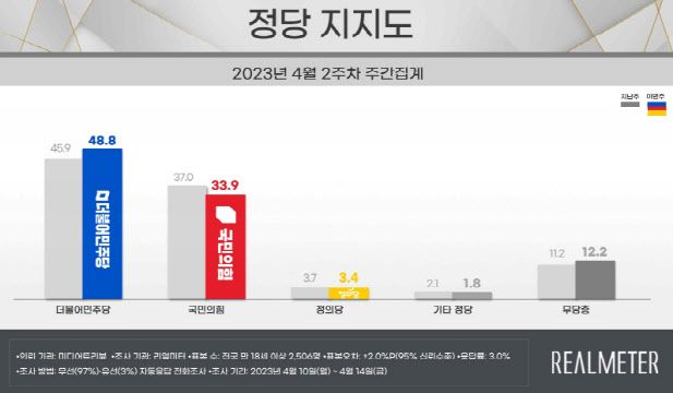17일 리얼미터가 미디어트리뷴 의뢰로 이달 10일부터 14일까지(4월 둘째 주) 닷새간 전국 18세 이상 유권자 2506명을 대상으로 조사한 결과, 정당 지지도는 국민의힘이 전주보다 3.1%포인트 내린 33.9%, 더불어민주당은 같은 기간 2.9%포인트 오른 48.8%로 집계됐다. 여야 간 지지율 격차는 지난주 8.9%포인트에서 14.9%포인트로 크게 벌어지며, 5주째 오차범위 밖 격차를 보였다.