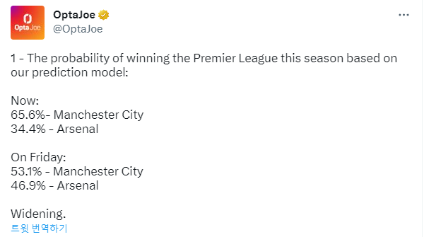 옵타는 "자사 예측 모델을 사용한 결과 맨시티의 우승 확률이 31라운드 전 53.1%에서 이후 65.6%로 12.5%p 상승했다. 반면 아스널은 31라운드 전 46.9%에서 34.4%로 떨어졌다"고 전했다.