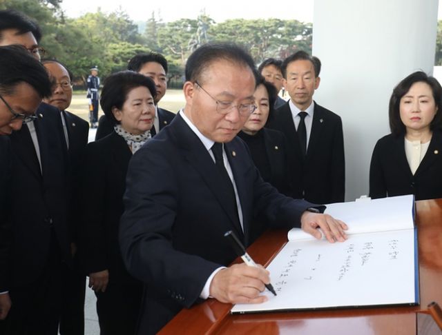윤 원내대표는 17일 오전 서울 동작구 국립서울현충원을 참배한 뒤 기자들과 만나 관련 질문을 받고 "민주당이 수사에 제대로 협조하는지 여부를 지켜보겠다"며 "국민적 의혹과 공분이 크기 때문에 신속한 수사로 국민께 진상을 제대로 밝혀야 한다"고 말했다.