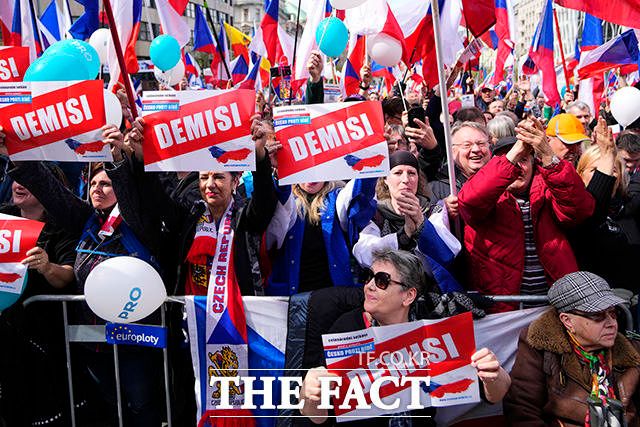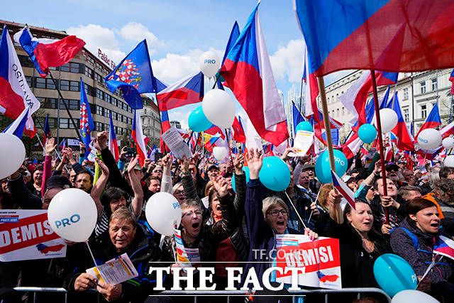 [더팩트ㅣ남용희 기자] 16일(현지시간) 체코 수도 프라하의 바츨라프 광장에 모인 시위대가 높은 물가에 항의하고 정권 퇴진을 요구하며 구호를 외치고 있다.