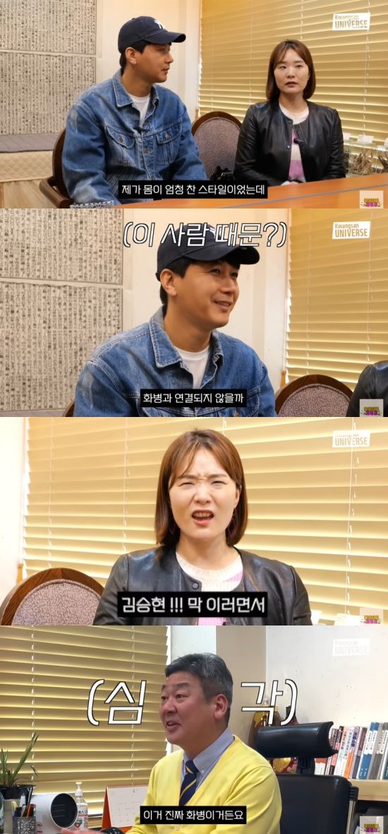 먼저 김승현은 "저희가 결혼 생활한 지 4년이 다 되어 간다. 같이 살아보니까 처음에는 제가 열이 많았었는데 반대로 이 사람이 열이 많아졌다"고 했다. 이에 장정윤이 "제가 원래 몸이 엄청 찬 스타일이었는데 갑자기 열이 많아지기 시작한 거는 혹시 화병과 연결이 되지 않을까?"라고 말해 김승현을 당황하게 만들었다.