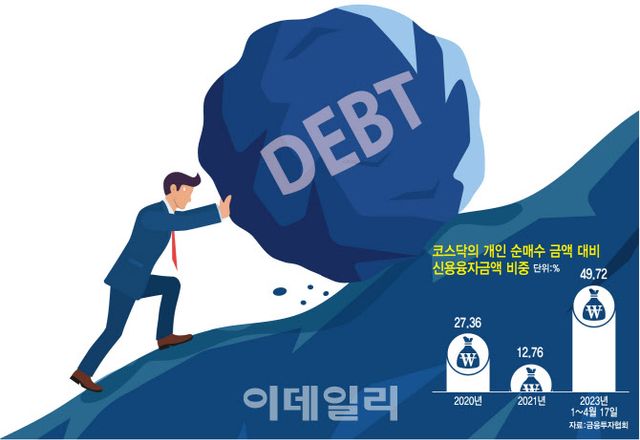 그런데 올해 개인의 코스닥 순매수액은 17일 기준 4조9598억원이다. 외국인과 기관은 연초 이후 3445억원, 3조2954억원 팔아치우며 매도 우위를 보이고 있다. 단순계산을 하면 코스닥을 끌어올린 역할은 ‘개인’이 해 온 가운데 이 중 49.72%가 빚이란 얘기다.