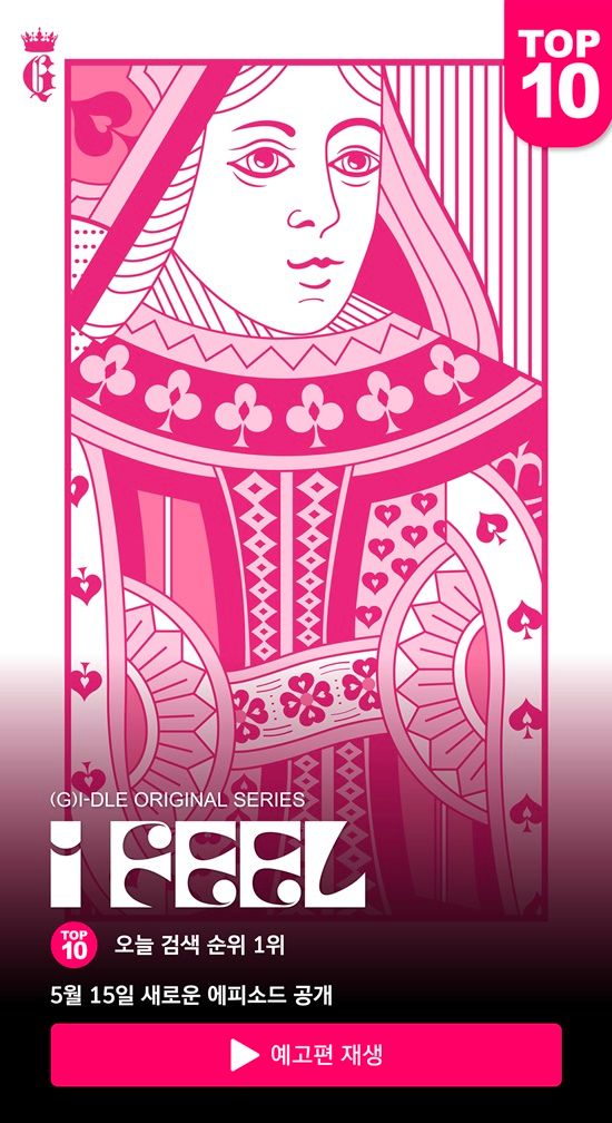 또한 우측 상단의 'TOP 10', 하단의 '(G)I-DLE ORIGINAL SERIES', '오늘 검색 순위 1위', '5월 15일 새로운 에피소드 공개' 등의 문구는 마치 OTT 플랫폼 메인 화면을 연상시키며 새 앨범에 대한 궁금증을 증폭시킨다.