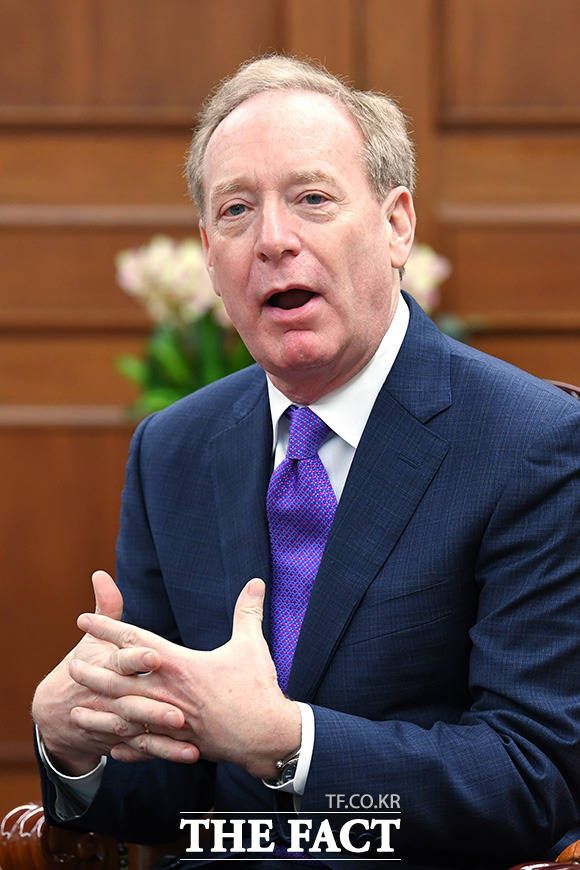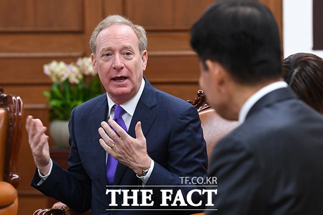 대화 나누는 김 의장(오른쪽)과 브래드 스미스 마이크로소프트 부회장.