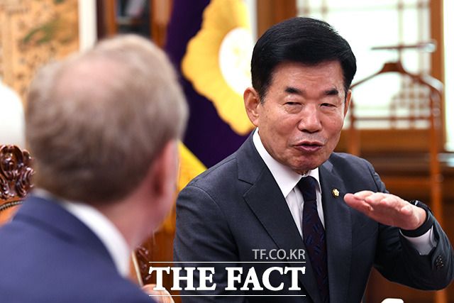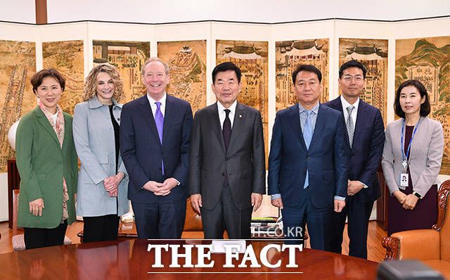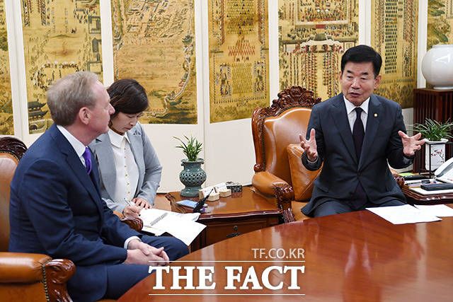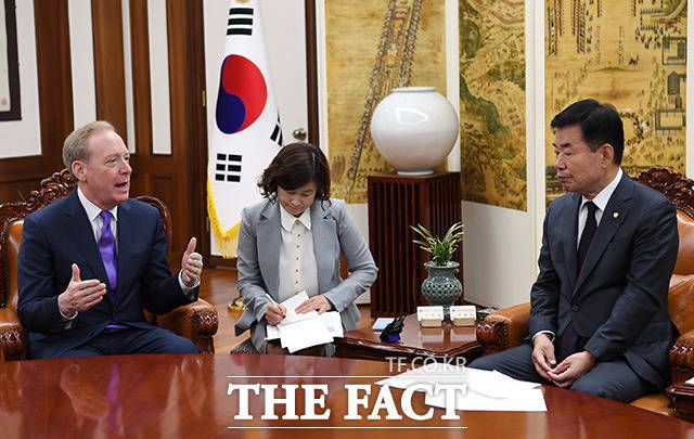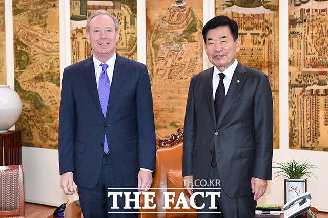 [더팩트ㅣ국회=남용희 기자] 김진표 국회의장(오른쪽)과 브래드 스미스 마이크로소프트 부회장이 18일 오전 서울 여의도 국회 의장실에서 만나 기념촬영을 하고 있다.