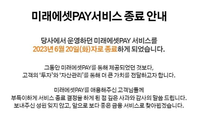 미래에셋페이는 공지에서 "그동안 미래에셋페이를 통해 제공했던 것 보다 고객의 '투자'와 '자산관리'를 통해 더 큰 가치를 전달하고자 한다"며 "부득이하게 서비스 종료 결정을 하게 된 점 깊은 사과와 감사의 말씀 드린다"고 밝혔다.